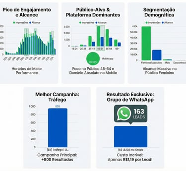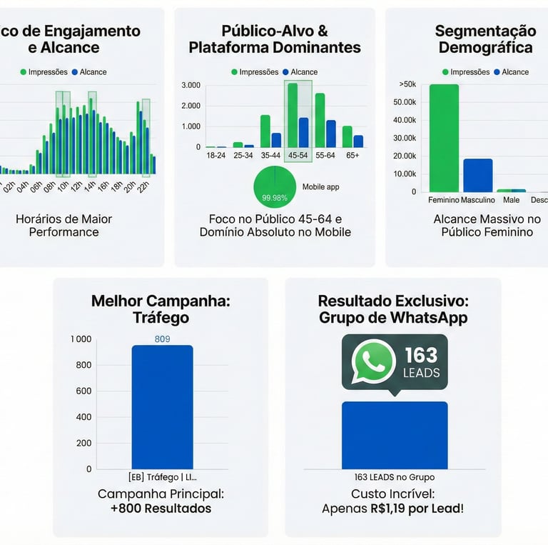 Picos de engajamento, alcance massivo, campanhas com +800 resultados e leads no WhatsApp por R$1,19!